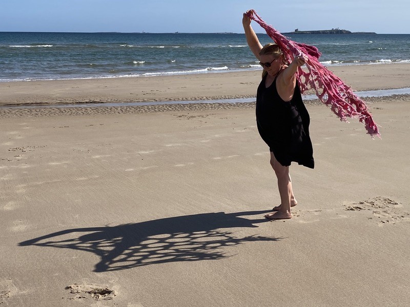 Frolicking with Flesh of my Flesh as a work in progress on the beach in Northumberalnd, August 2024. Click for the full image.