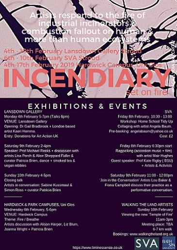 ‘Incendiary is a multi-site exhibition consisting of 23 artists and the Walking the Land Artists collective responding to the firing of industrial-incinerators & combustion fallout on human & more than human ecosystems. It is exhibiting in Stroud at SVA and Lansdown Gallery, as well as the University of Gloucestershire’s Hardwick Campus, Cheltenham.