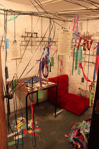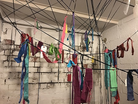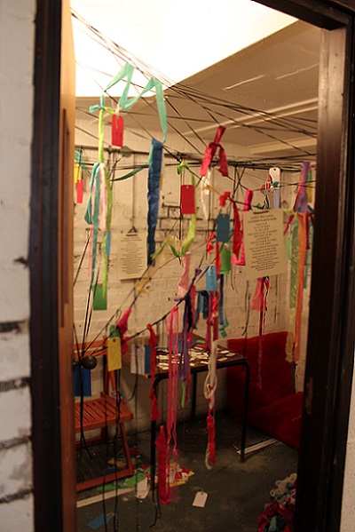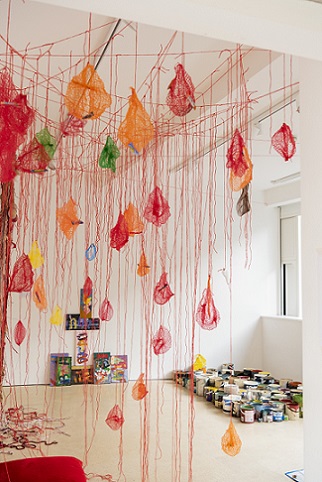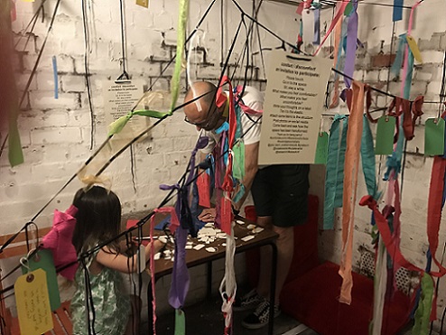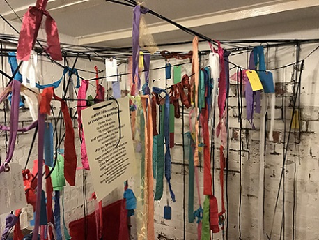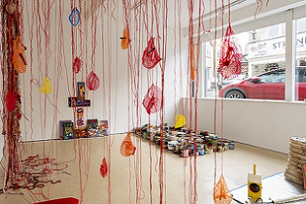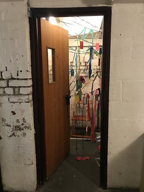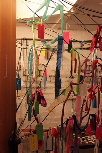 My participatory installation, Tethering our thoughts, string, fruit nets, labels, at Incendiary exhibition (SVA), Day 1. (Image: Mike Garlick