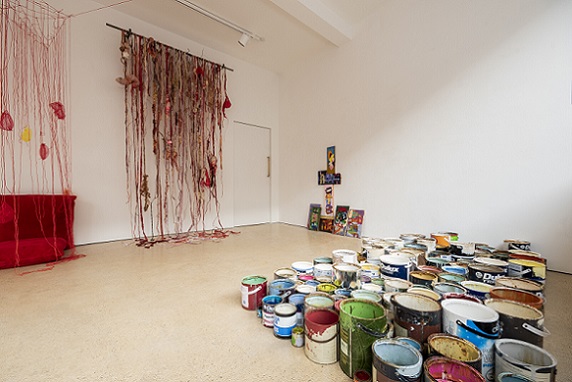 General view of Incendiary at SVA. Clockwise from left, Lou Baker, Tethering our thoughts, Fiona Campbell, Glut, Angela Baum, Floored, Nicola Grellier, Paint tin, Mair Hughes, Ragpicking (Image: Mike Garlick)