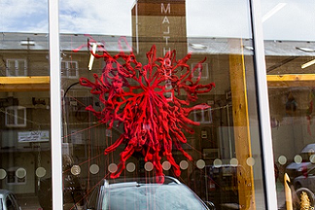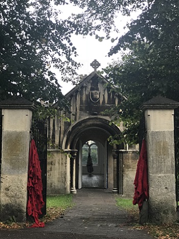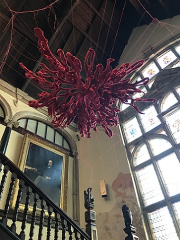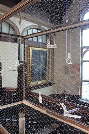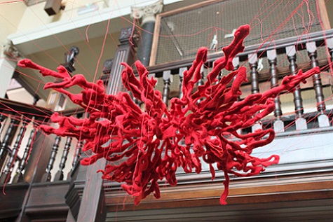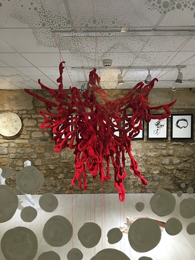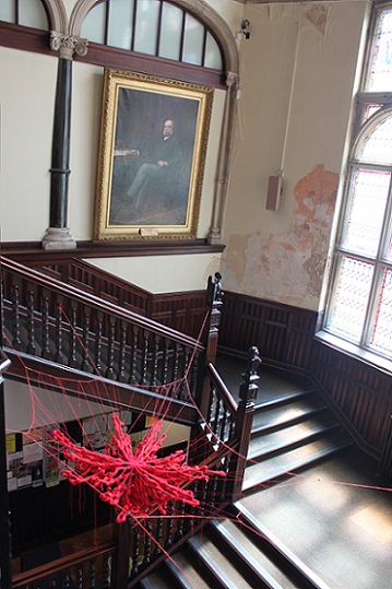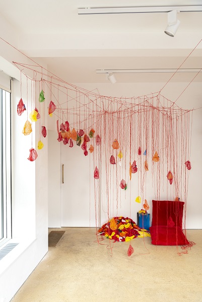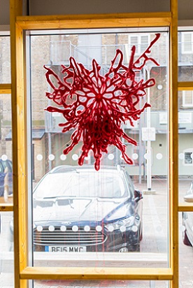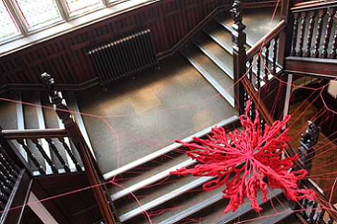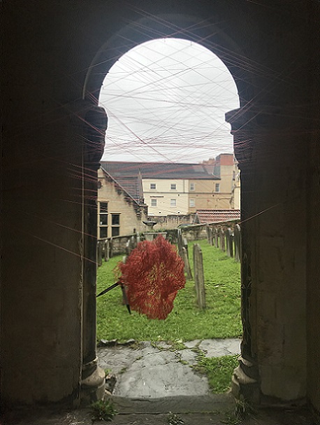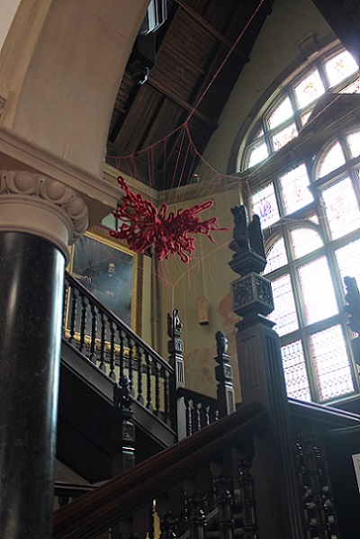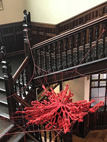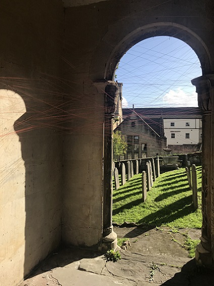 During the exhibition, I also made a site responsive installation outside the chapel in the porch using red monofilament. I loved making it. It was like drawing in space. The chapel is a listed building so I couldn't make new holes which meant that I had to use the holes that were there, so there were limits to what I could do. I really enjoyed seeing what was possible within these parameters. The installation was a transformation. It was almost invisible, sparkling, magical. I'd like to do something similar in a much larger space.