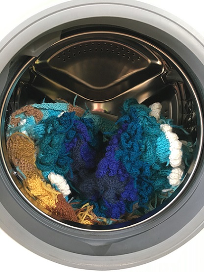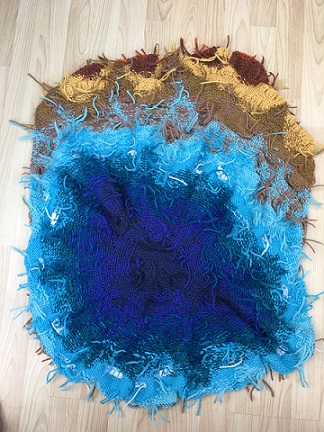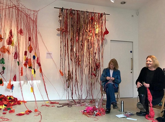 For Baker, the process of knitting is as important as the product. Knitting in private is her ‘stream of consciousness’ knitting - she has no pattern just a few rules, makes decisions as she knits and the form develops intuitively. She very quickly enters a state of meditative timelessness which induces a profound sense of wellbeing. The psychologist Csikszentmihalyi describes this as the state of flow; it is caused by deep concentration, where levels of skill match levels of challenge. It is often linked to creativity and, ultimately, to happiness. Knitting in public, however, acts as a people magnet, initiating interactions with strangers. Baker regards her knitting as a memory catcher, as thoughts, emotions and conversations are knitted into the fabric of the piece.