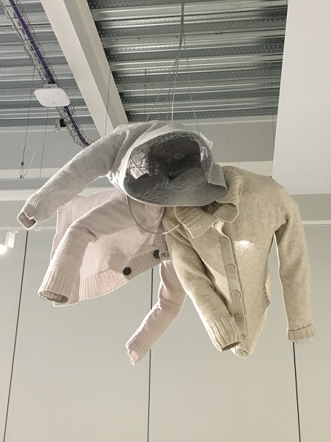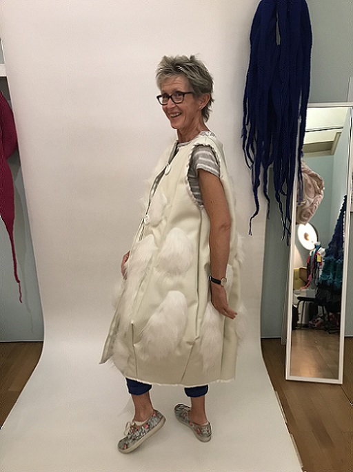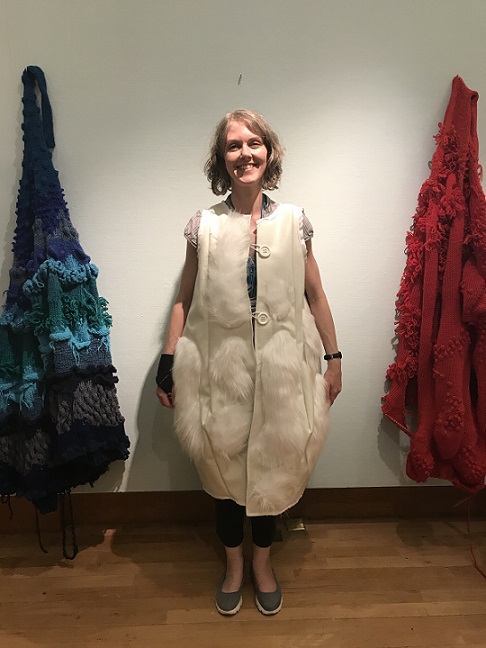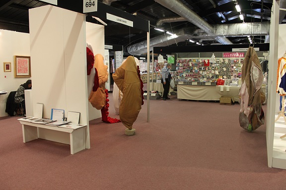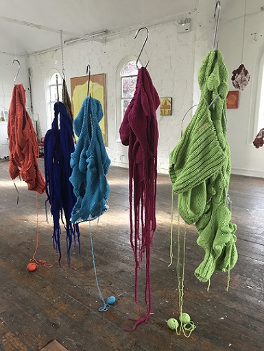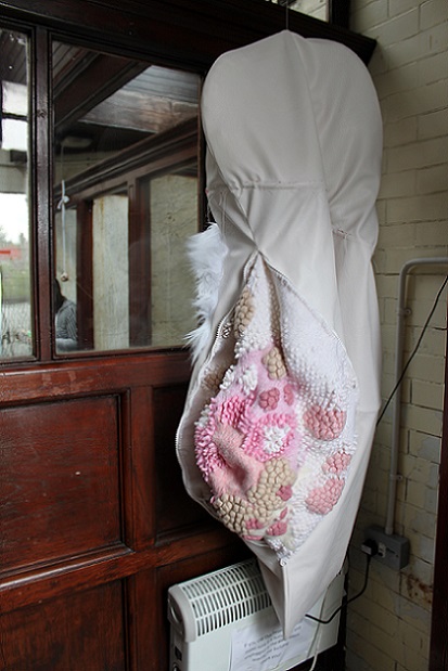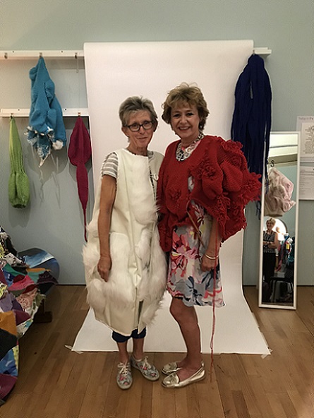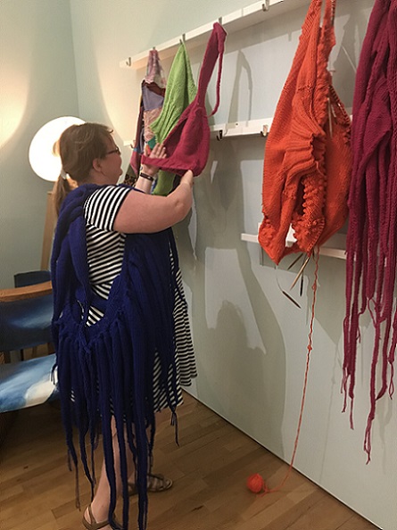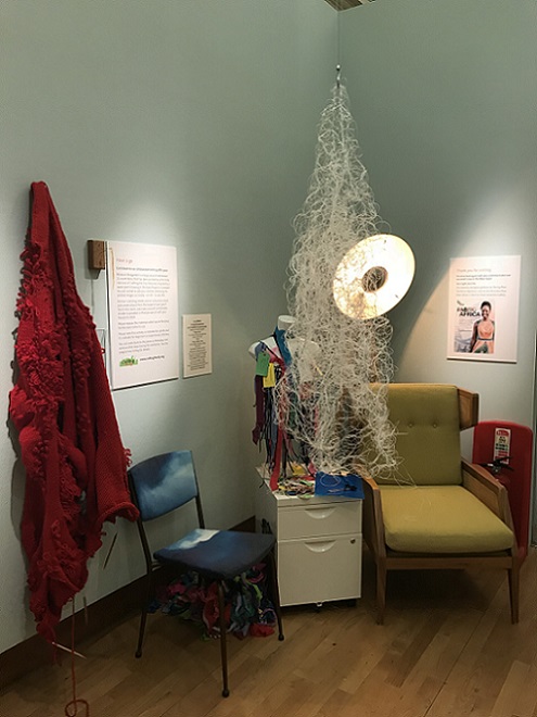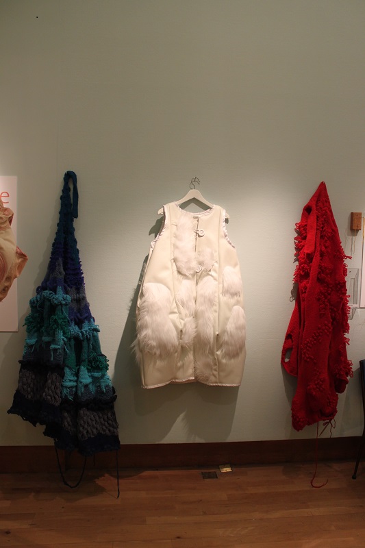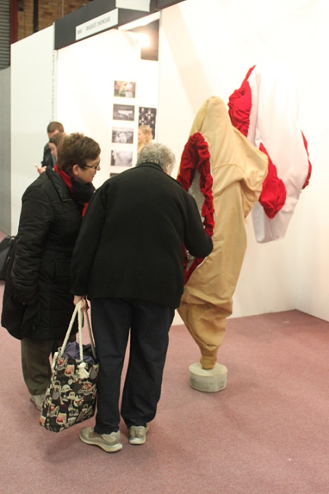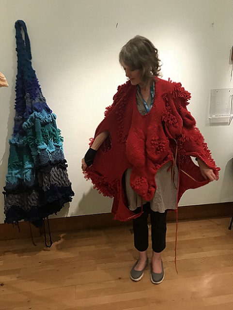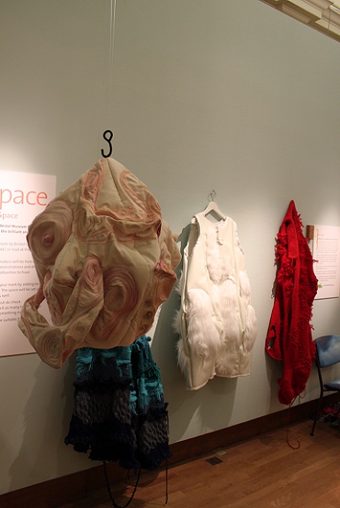 I invited my visitors to become living sculptures by wearing a soft sculpture, or several! I had made 6 new oversized garment-like sculptures- 5 knitted ones in vivid colours and one furry, white stitched sculpture. I also included several of my original soft sculptures which can also be easily worn. I had fun working out ways to install them so that they were readily accessible!