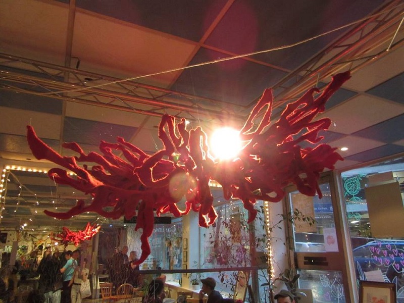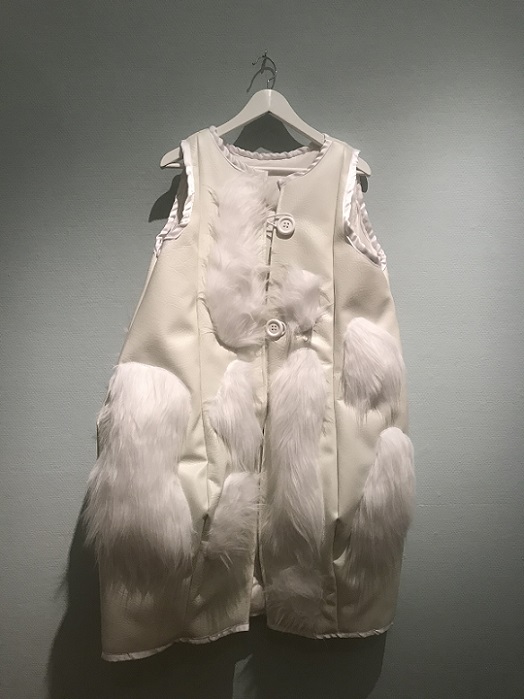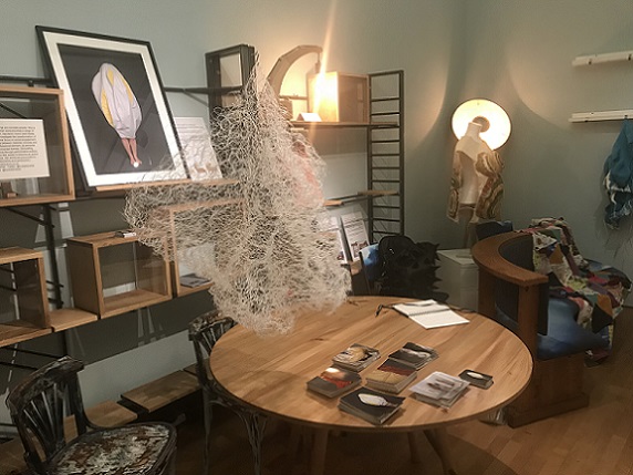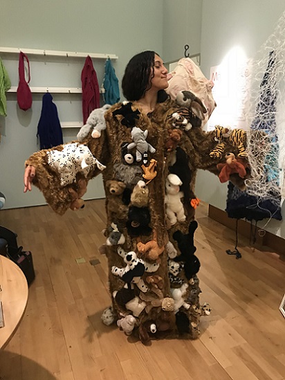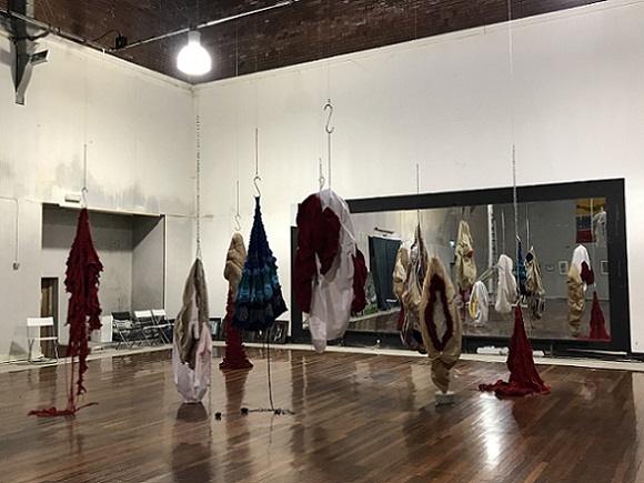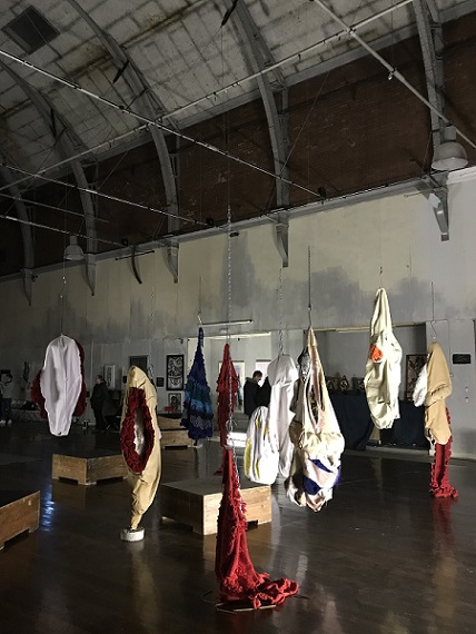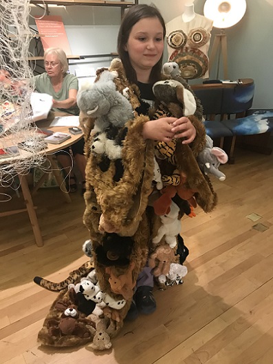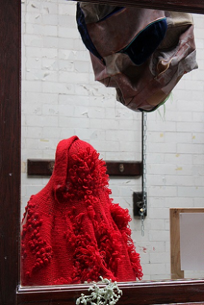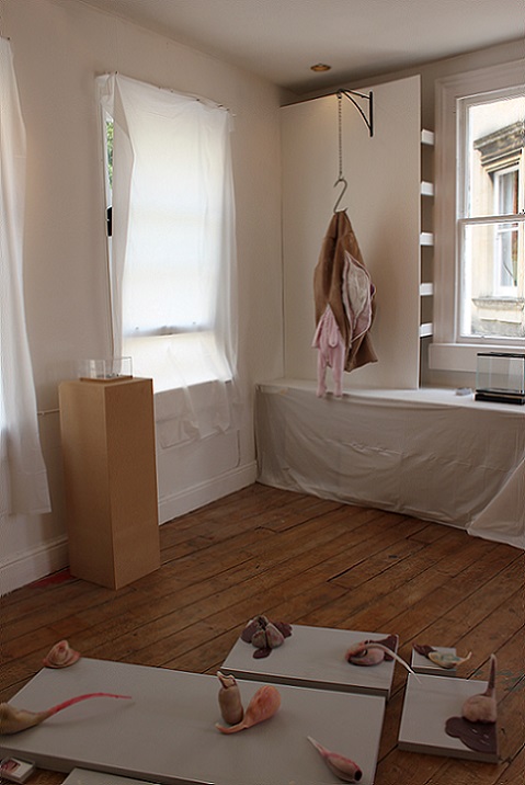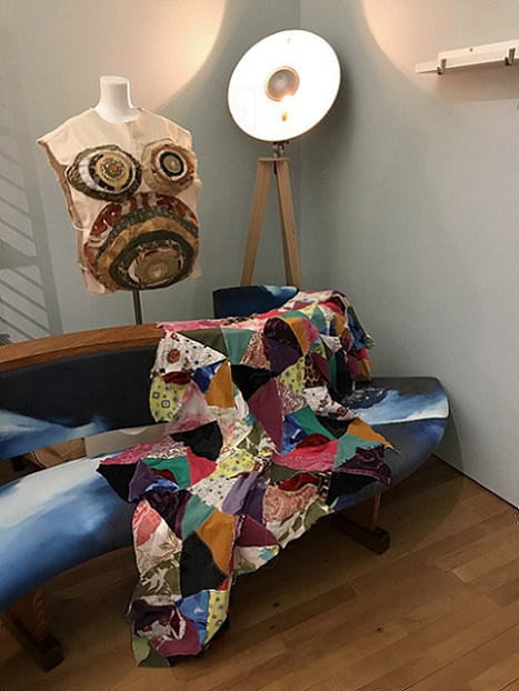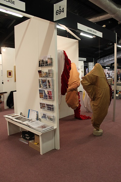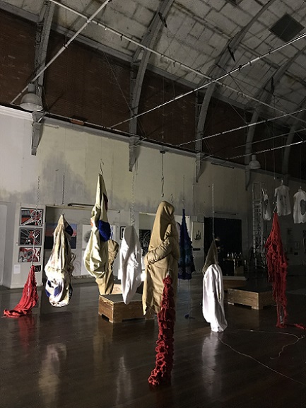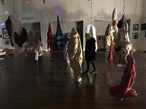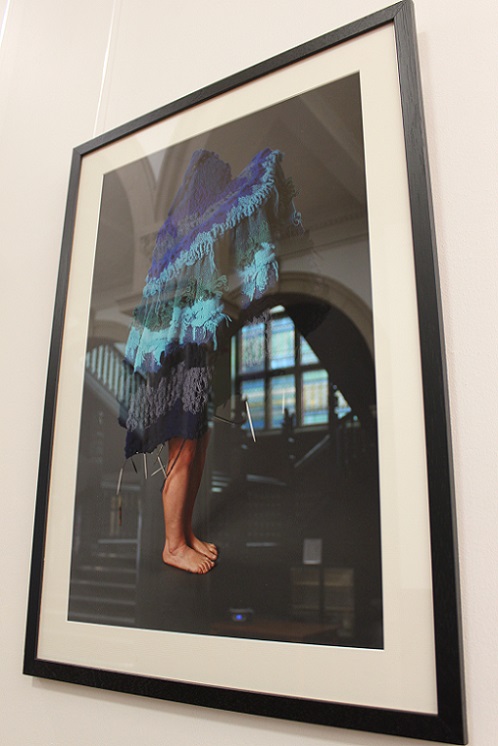 I invited my visitors to become living sculptures by wearing a soft sculpture, or several! I had made 6 new oversized garment-like sculptures- 5 knitted ones in vivid colours and one furry, white stitched sculpture. I also included several of my original soft sculptures which can also be easily worn. I had fun working out ways to install them so that they were readily accessible!