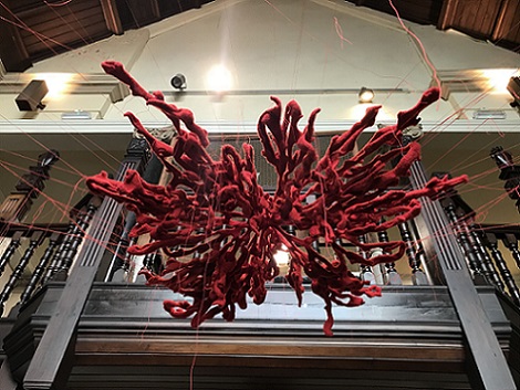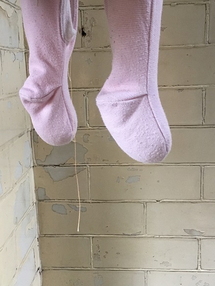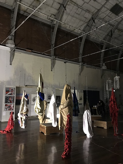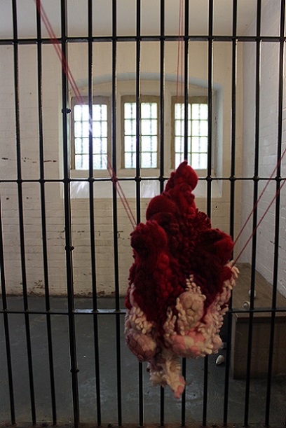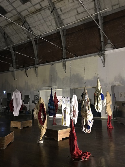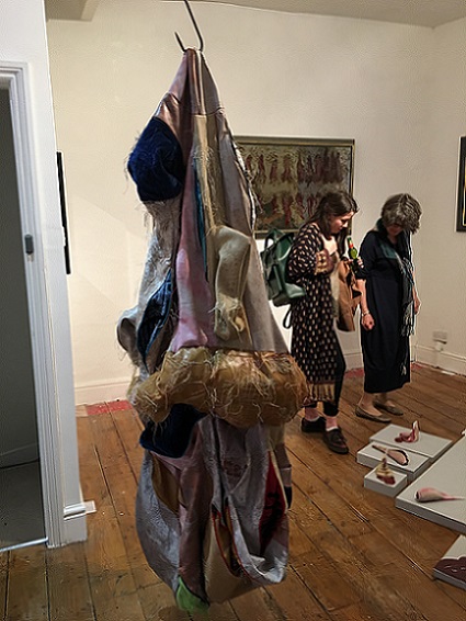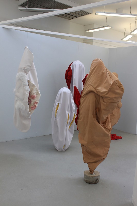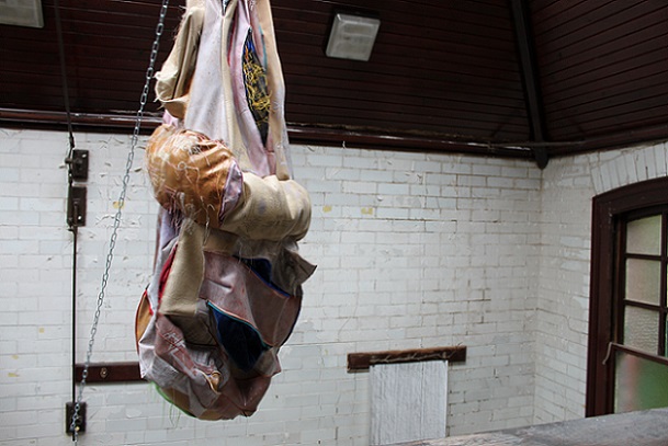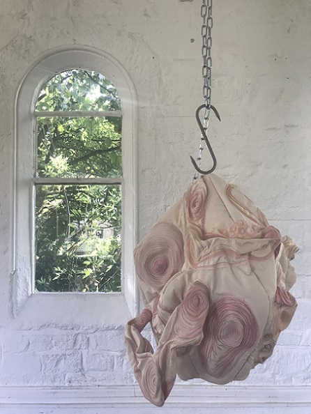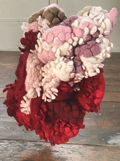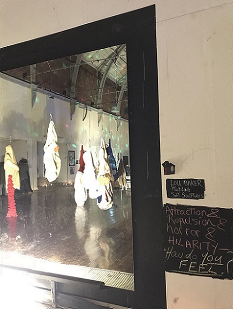 Attraction and repulsion, horror and hilarity; provoking a range of conflicting responses, Lou Baker’s hanging soft sculptures explore individuation, a process which, according to Carl Jung, needs to occur in the second half of life, of finding meaning in life. It is ultimately a preparation for death. Jung talks about balancing our multiple selves with the dark side, or shadow, of ourselves and maintains that failure to acknowledge and accept this shadow can result in fragmentation and associated mental health issues. He also describes the shadow as being the seat of creativity, and creativity is linked to happiness.