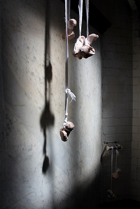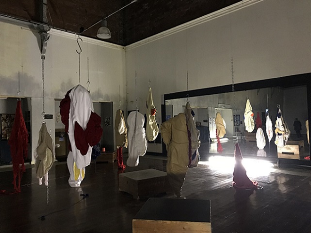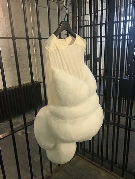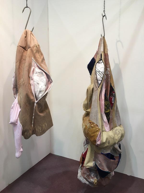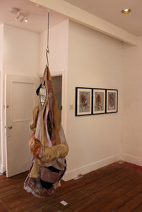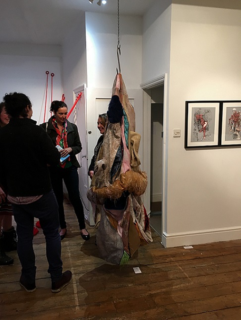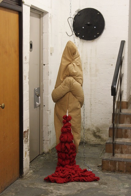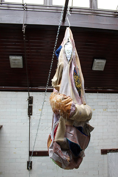 That Baker chooses to use cloth and knitting in sculpture, with their associations with craft and the feminine, powerfully subverts traditional representations of the body. The soft, impermanent nature of cloth evokes the human form and its mortality, revealing alternative meanings in its folds and surfaces. There are multiple femininities associated with used clothing, recycled imitation leather and human hair linked to dirt and contamination anxiety which also add meaning to her choice of materials. She has researched the ways other artists, especially Christian Boltanski and Louise Bourgeois, use empty second-hand clothing in their work to suggest a physical absence and ultimately, death, the most extreme abjection. By hanging her sculptures, Baker also conveys a sense of vulnerability and ambivalence which contrasts powerfully with the violent intensity of the piercing with meat hooks, and the chains.
