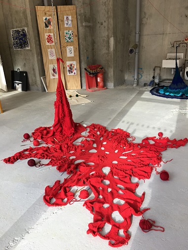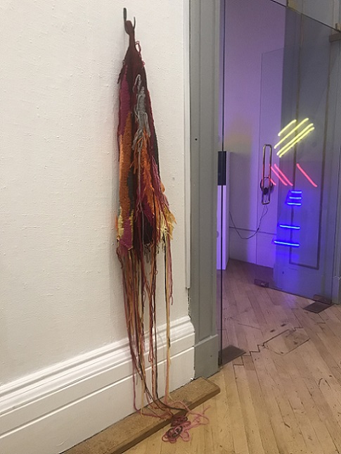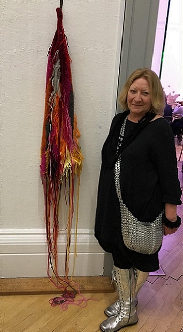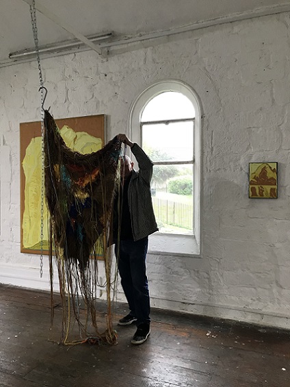 My knitted soft sculpture Internal monologue hanging in front of one of Clare's paintings