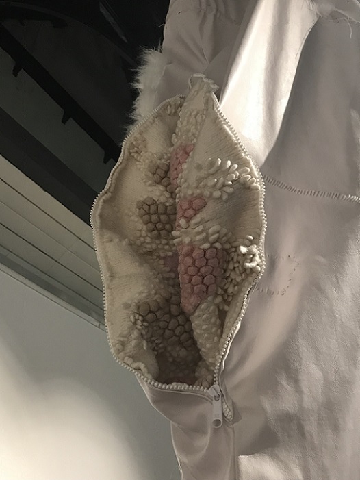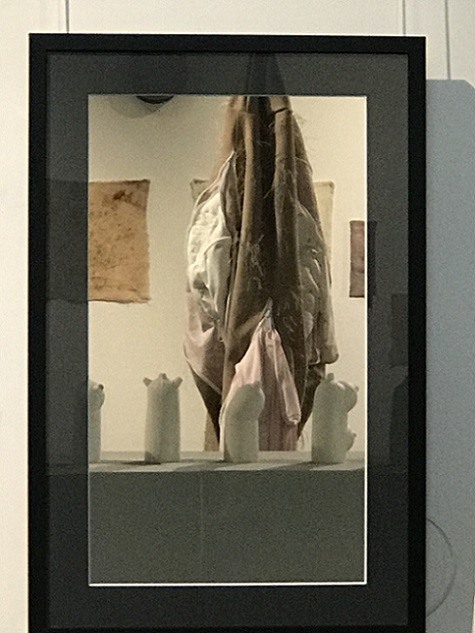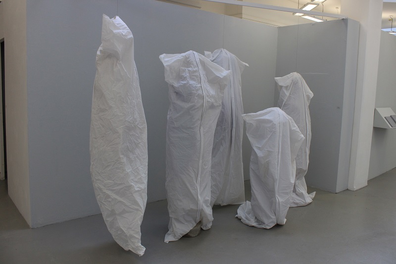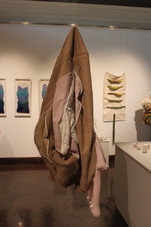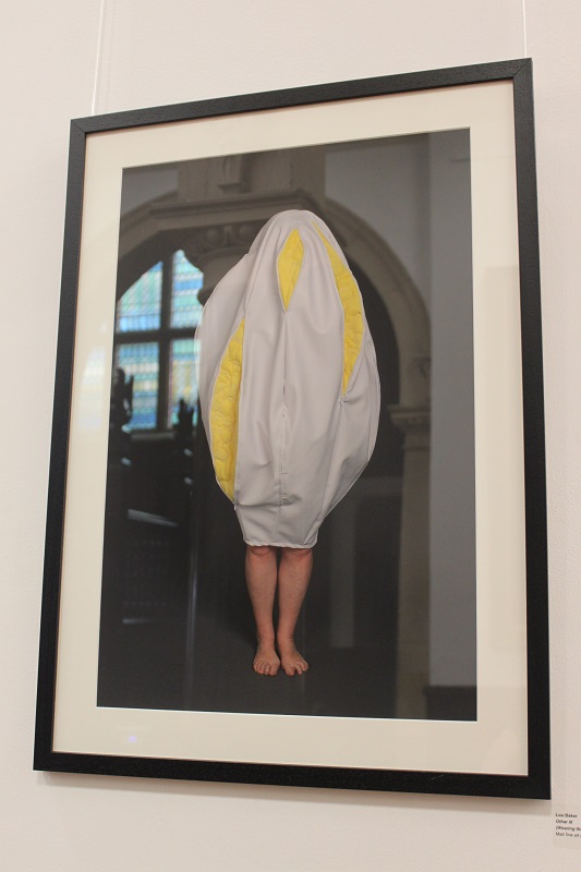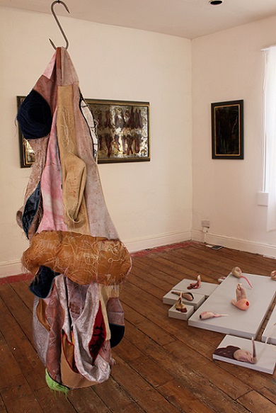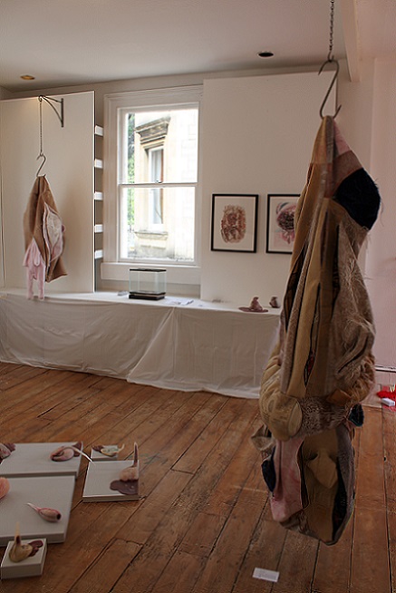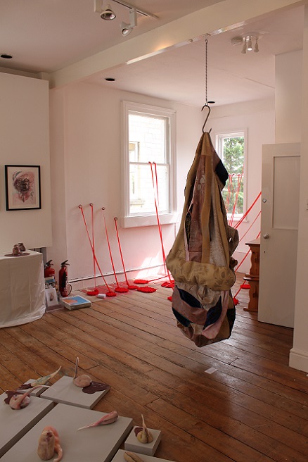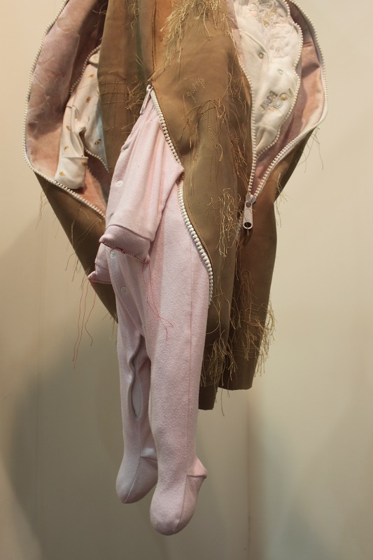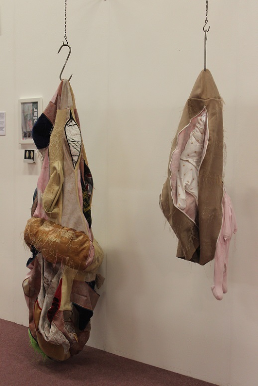 Inspired by the discarded, frame-like remains of the photos she had cut up to make a photo montage book for her only son for his 18th birthday, Baker developed the idea of ‘body … no body … nobody’. Sculpted using a selection of skin-like materials and her son’s old clothes, these disturbing body-like forms examine her responses to her only child growing up and leaving home and the impact that has had on her life. They communicate the depth and range of emotions involved in this transition, in terms of identity and purpose, loss and absence, through the visual language of abjection. Memories and the emotions they elicit vary in intensity and clarity; some are public and shared, some are private and hidden. Using zips as a device to visualise the liminal space between that which is revealed and that which is concealed, Baker provides a potentially changeable threshold between her interior and exterior selves which blurs boundaries and adds poignancy to the precarious separation between self and other.