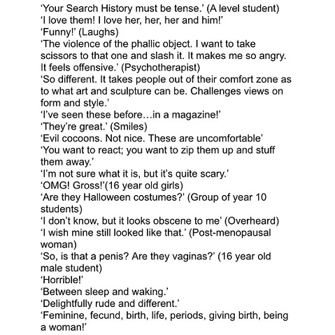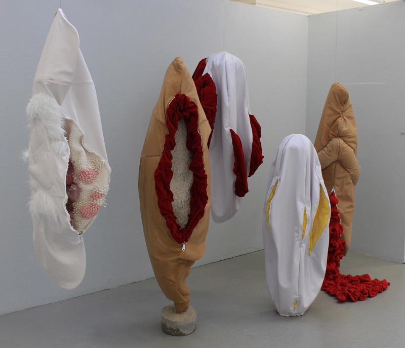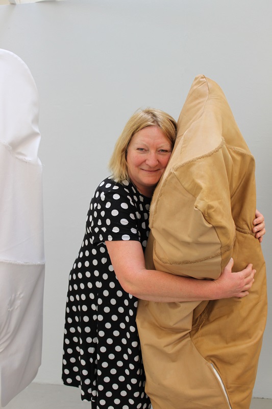 Baker regards her work as a form of self-portrait, a reflective and emotive response to the ongoing excavations of her dark side; an embodiment of a mid-life crisis. However, there is also a playful aspect to her work. That many people see genitalia is one; sculpting her aging body as an assortment of oddly quilted, saggy body bags is another! ‘They can be whatever you want them to be.’