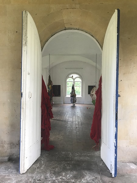 3 - 6. Walking into disquiet at Walcot Chapel, flanked by my knitted diptych, Heart of darkness