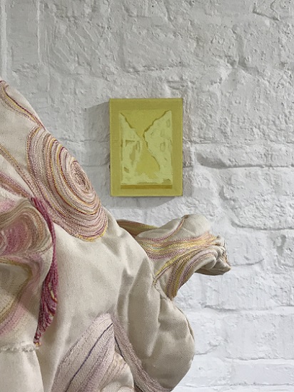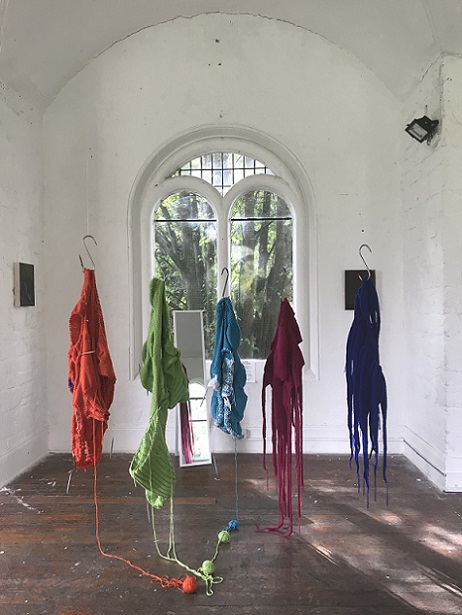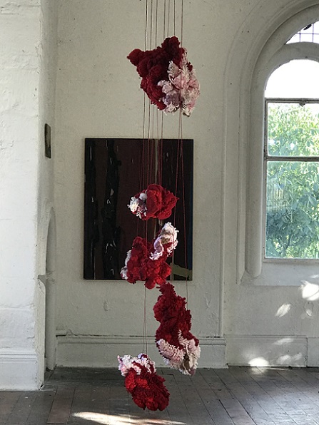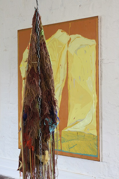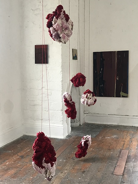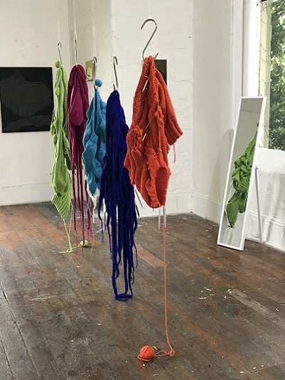 At first glance, the two artists’ work seems utterly dissimilar; Clare works with oil and pigments, creating two dimensional paintings, whereas Lou uses knitting and stitch to make body-like sculptural forms. On closer inspection, however, affinities between their works become evident.