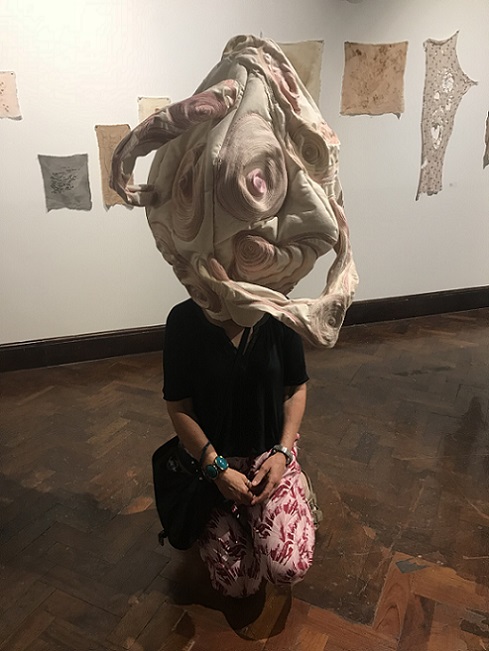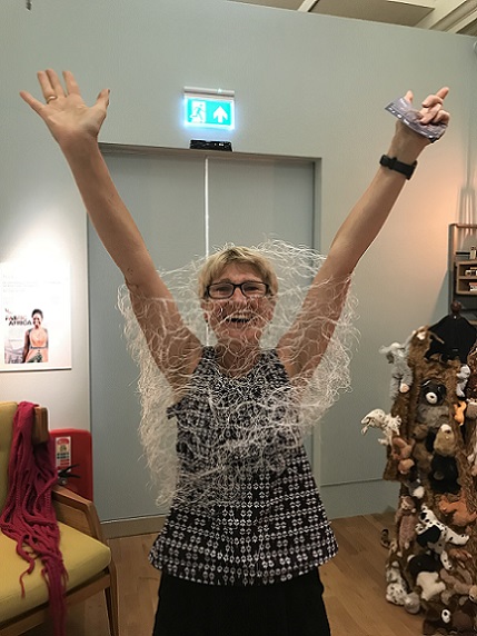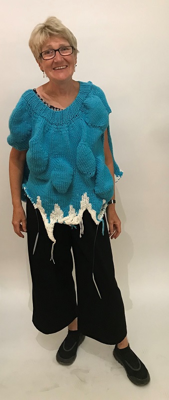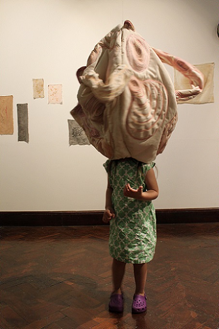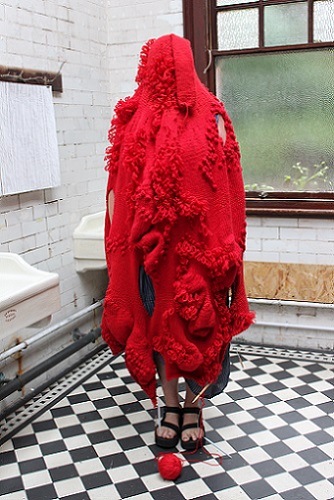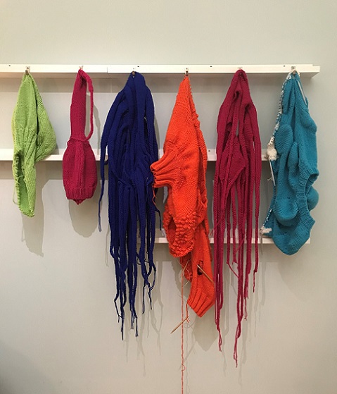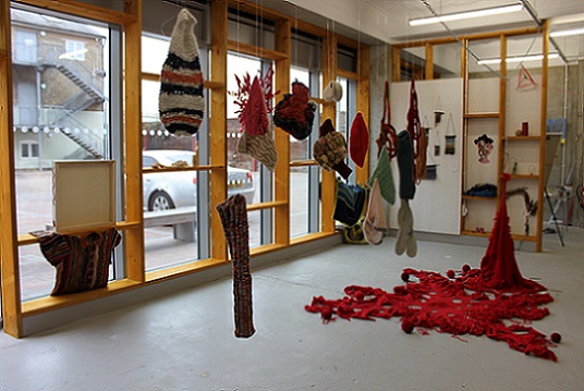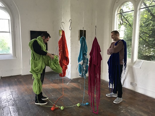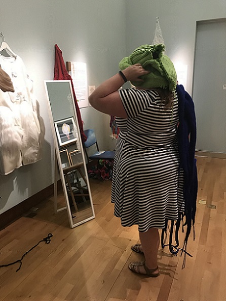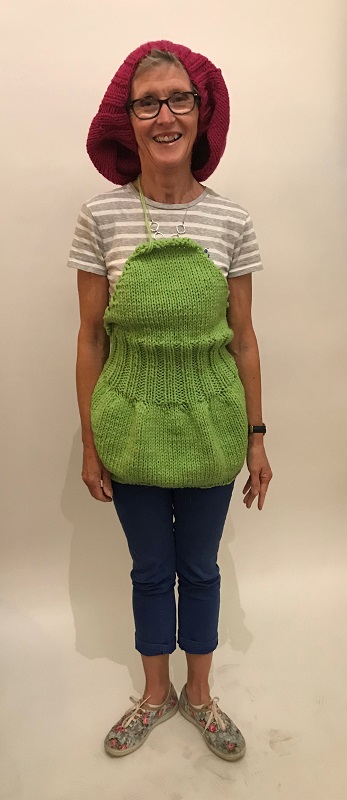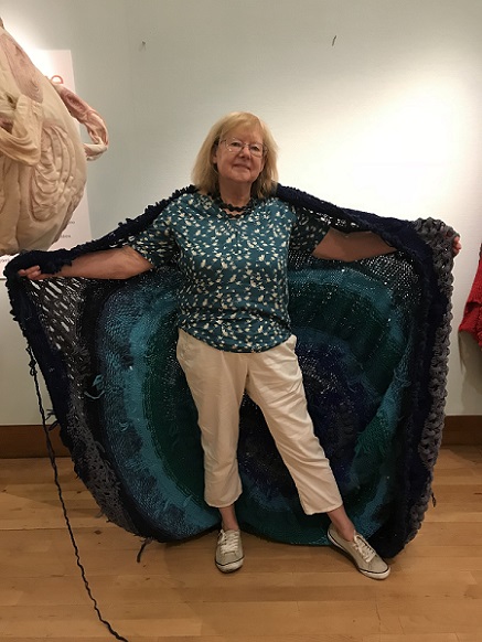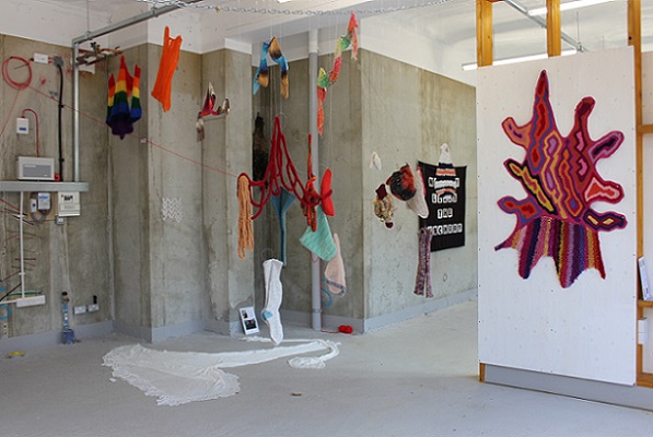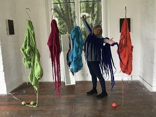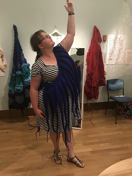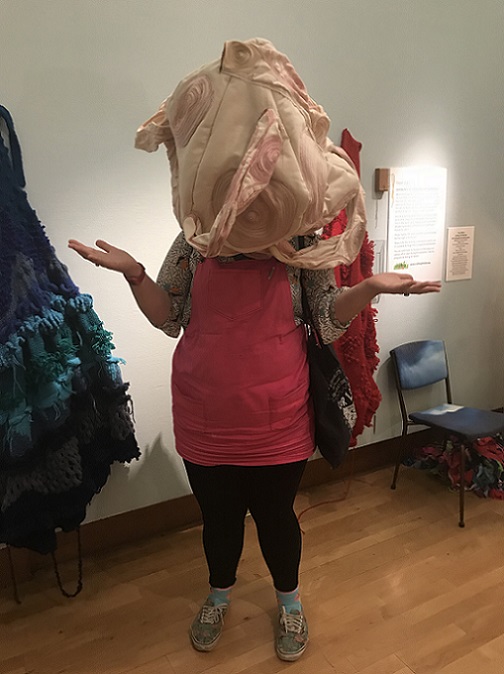 is an interactive, participatory installation of wearable, hand knitted and stitched soft sculptures. Normally, in an art gallery, there are signs saying ‘Do not touch’; what happens if the viewer is not only encouraged to touch but is invited to become a living sculpture by wearing an abstract soft sculpture? What would it look like? How would it feel?