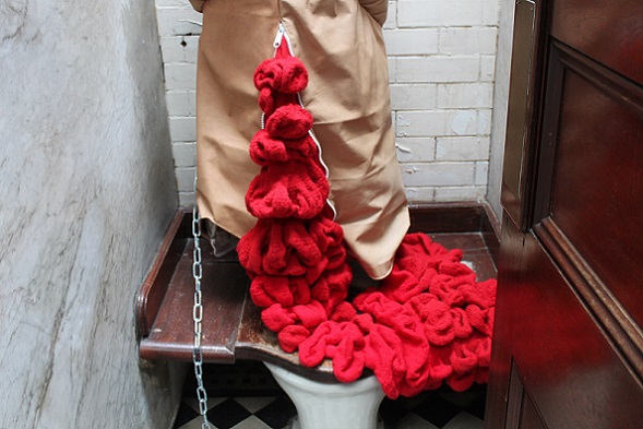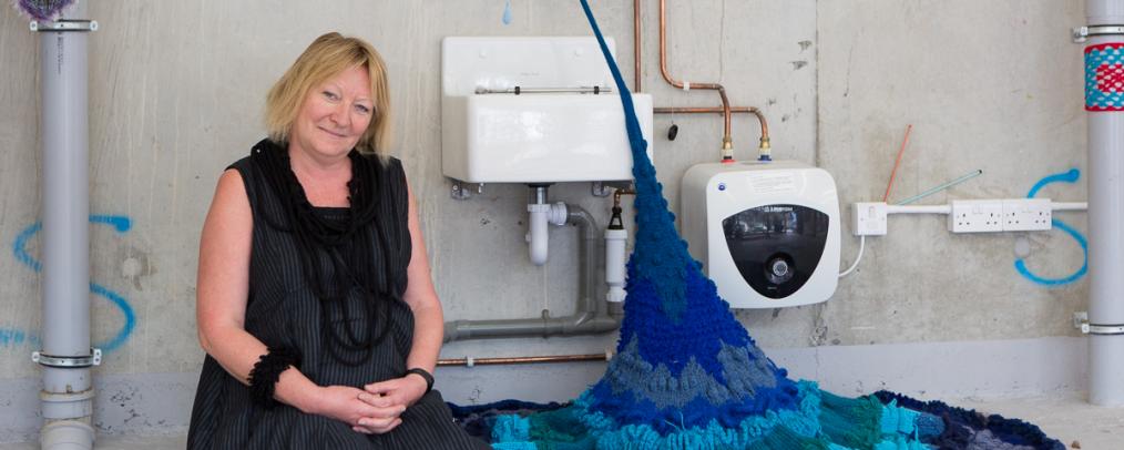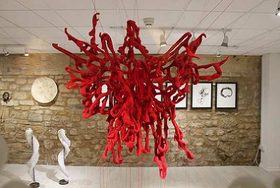 Lou Baker challenges the stereotypical expectations of knitting in many ways. She blurs the boundary between craft and fine art by adapting and developing established knitting techniques to create provocative sculptural forms which evoke an abject response. Her work forges intellectual connections between material, process and concept, exploring meaning by combining the traditional with the surprising. The soft, impermanent nature of yarn, as an unconventional medium in fine art, adds to the meaning it conveys; knitting with unexpected materials such as plastic or metal adds another dimension. Her troubling forms create an uneasy tension in aesthetics and examine the possibilities of there being a dark side to the perceived notions of knitting as a gendered, decorative, safe, clean, perfect and private pursuit. The language of knitting takes on new meanings in a fine art context; ‘tension’, ‘unravelling’, ‘casting off’, ‘blocking’ and ‘spinning a yarn’, amongst others, adds poignancy to her work.