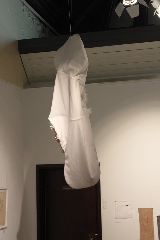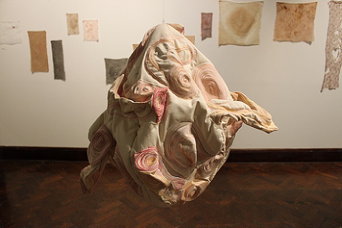Baker’s work challenges stereotypical, gendered expectations of work with textiles in many ways. It blurs the boundary between craft and fine art by using traditional stitch techniques to create subversive sculptural forms which evoke an abject response. Her emotive forms and gestural stitches excavate the possibilities of there being a dark side to the perceived notions of embroidery as a gendered, decorative, safe, clean, perfect and private pursuit.