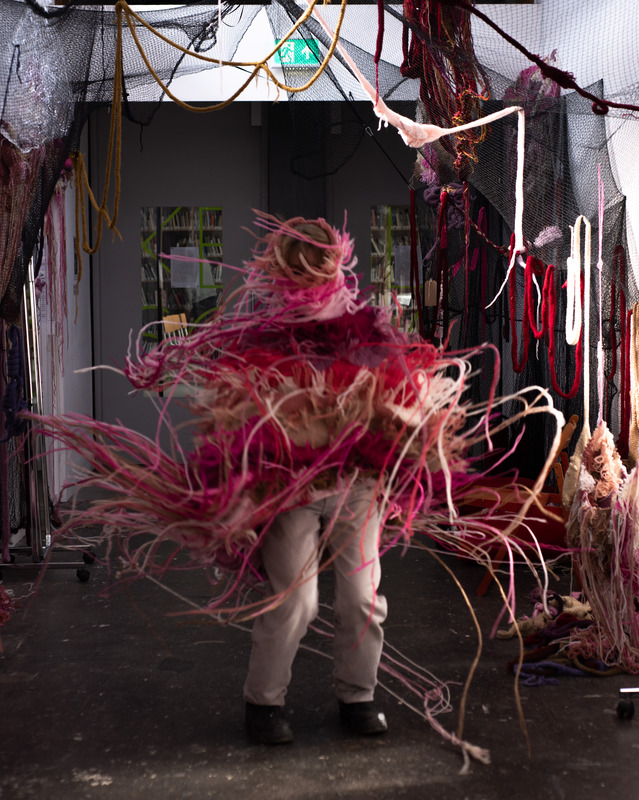 Lou’s dreamlike den, Made flesh, on the other hand, is intentionally ‘sloppy craft’ abstract and formless, unfinished and unravelling. Knitting and stitch should be comforting yet there’s something disquieting about this maximalist, fleshy installation. And, in stark contrast to the PLEASE DON’T TOUCH extreme fragility of Lola’s work, Lou invites the viewer to PLEASE TOUCH, to add to and even to wear her work; to become part of it.