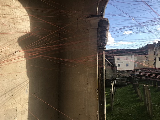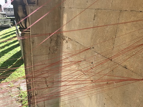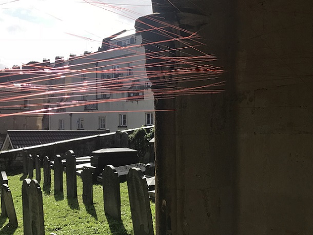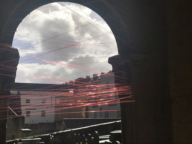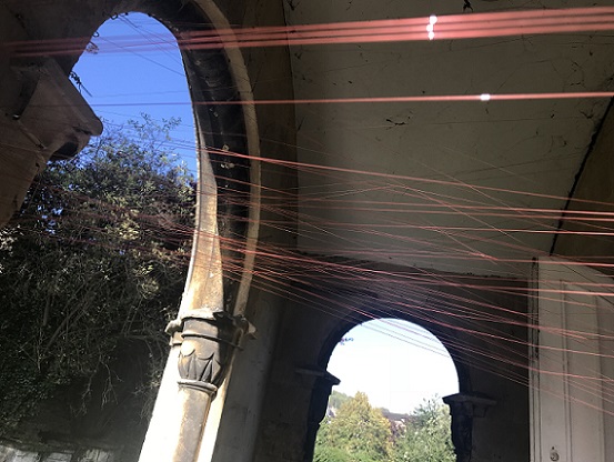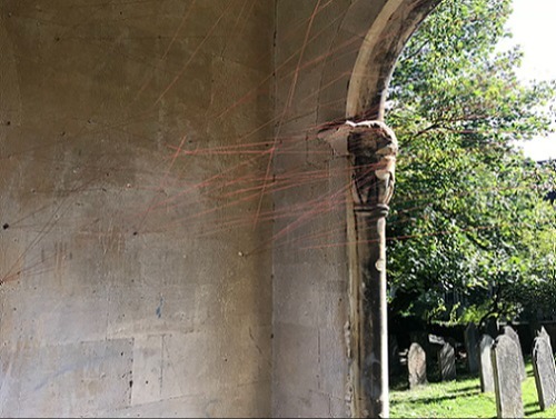 Walcot Chapel is a old mortuary chapel surrounded by a decommissioned graveyard. It's a listed building so for the installation, I was only able to use attachments that were already in place, so these rather random fixings dictated the form of the installation to some extent. I installed this work over three days of the exhibition as performative making. I see it as a form of drawing.