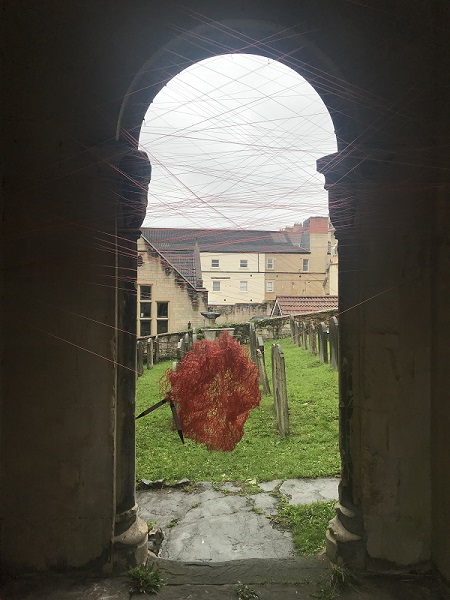 My beating heart is a site-responsive installation of red monofilament installed in the porch at Walcot Chapel, Bath for 'disquiet', a joint exhibition with Clare Thatcher, 18 -23 Sept 2018. Suspended within a network of red monofilament is a small, hand knitted abstract sculpture, my heart, made with the same material. It's still attached to the knitting needles so I could potentially continue to knit it or it could unravel. The unruly lines of the knitted piece present a stark contrast to the almost invisible geometric lines dividing the space.