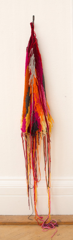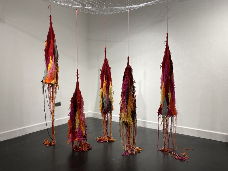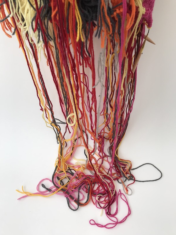 Pillars of fire and rage is a series of five hand knitted, hanging sculptures. Each knitted sculpture is given form by a circular knitting needle, which still holds the unfinished stitches. The knitting could potentially be continued... or unravelled. Have a look at my MA Fine Art Research website for some of my reflections on what I call my sloppy knitting, the making of these sculptures and my take on deliberately sloppy craft.