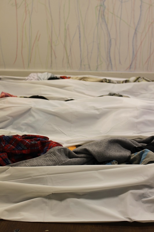 Used clothing, washing line, pegs, body bags