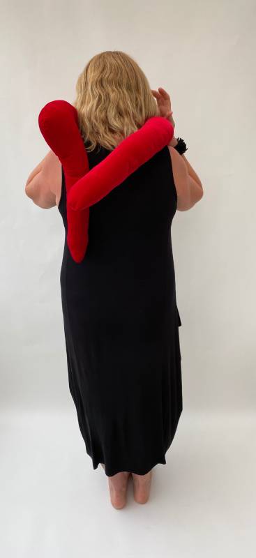 Velvet hug is a stitched wearable, red velvet sculpture, worn by the artist and photographed at home as part of a private performance during lockdown. There was an audience of one, the photographer.