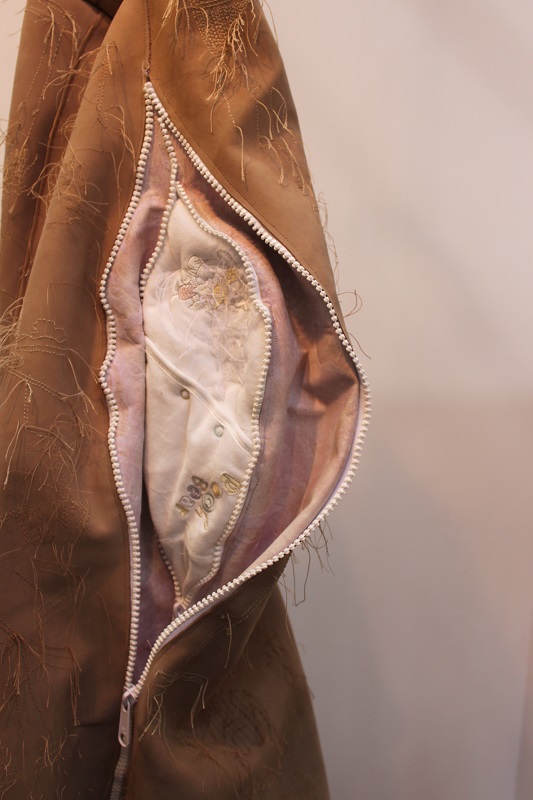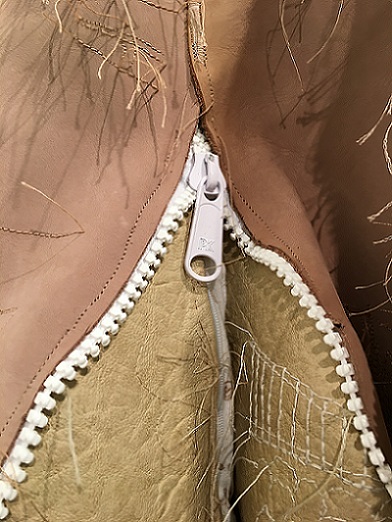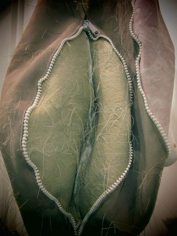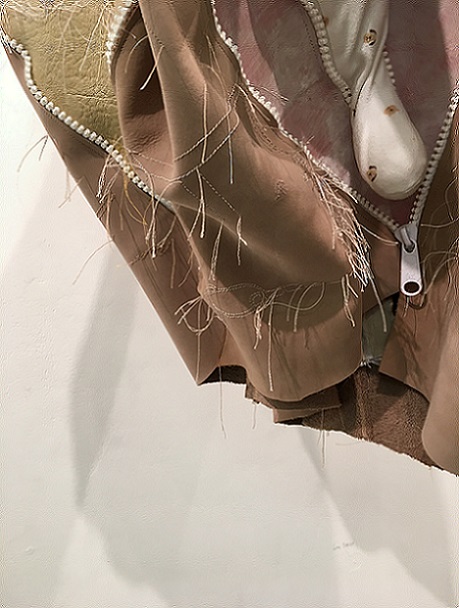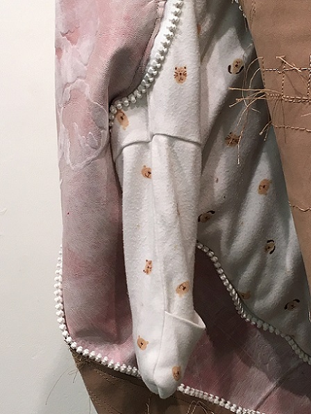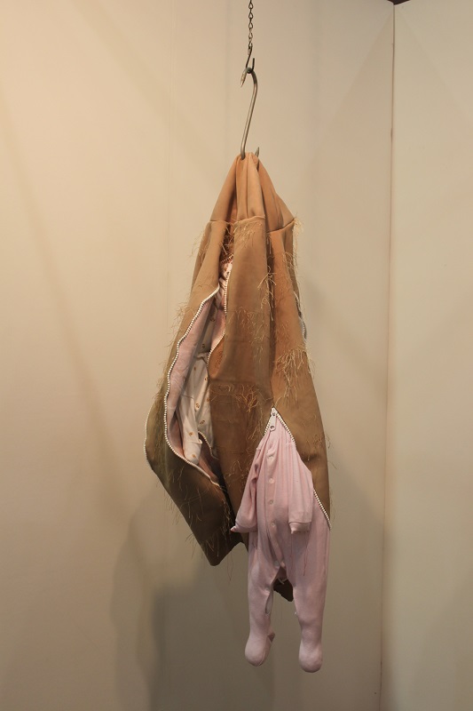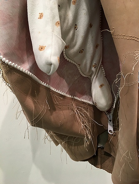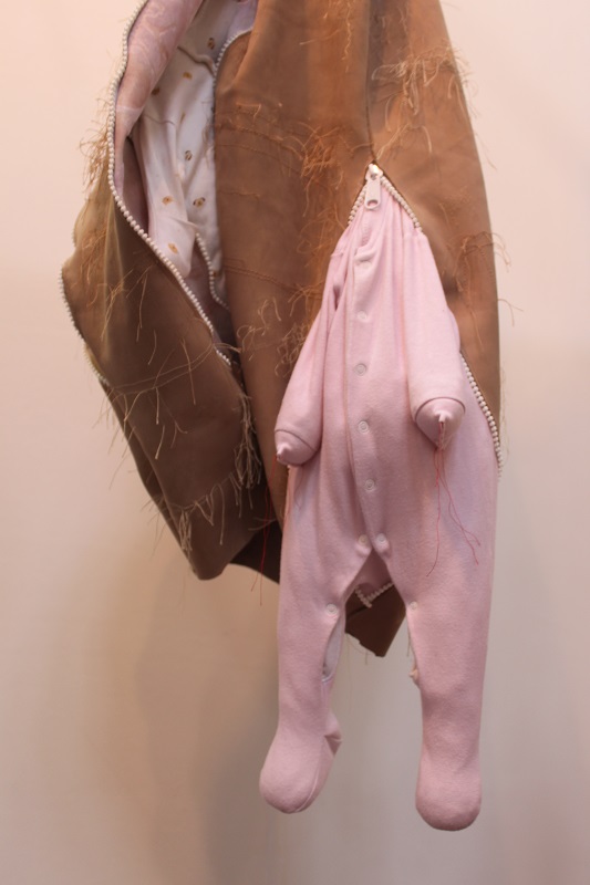 As part of my Embroiderers’ Guild Scholarship I have been exploring further the sculptural capabilities of leather and stitch to provoke an abject response. Leather is obviously the closest material to human skin that I can legally use; it is skin! Skin is the boundary between self and other. For All the babies I might have had 2 I have used a tan nubuck leather hide, which is suede-like and has an interesting rigidity. I have stitched quilted and partly stuffed baby grows, with beanie sections, into the zipped openings.
