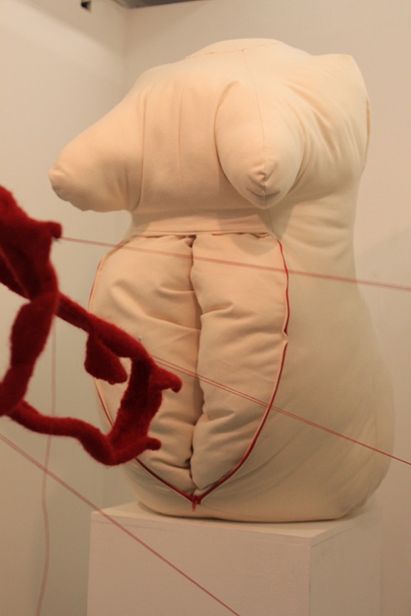 All the babies I might have had was my final piece for my Art Foundation at Bristol School of Art in June 2011. It was originally installed as a diptych - a suspended web of felted knitting partly obscuring a life-size sticthed canvas torso with a zipped opening. (See images 01 to 05 below.)