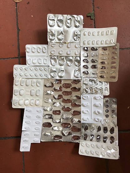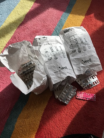 I have been collecting empty pill packets for a while. I’m interested in them for several reasons. I have to regularly take tablets myself so I gather a few a month; if I’m unwell, of course, the pile grows. I have also discovered, through this strange collecting obsession, that a number of dear friends have to take many tablets every day to stay well. It is subsequently very poignant when I receive their latest stash, a bag or bundle of pill packets. It feels like some sort of ritual of care as we remember together and feel grateful for these medications that keep us alive.