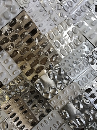 Update September 2024: For more sculptural experiments with pill packets, see Pharmacopoeia 2, 2024. This time I used stitch.