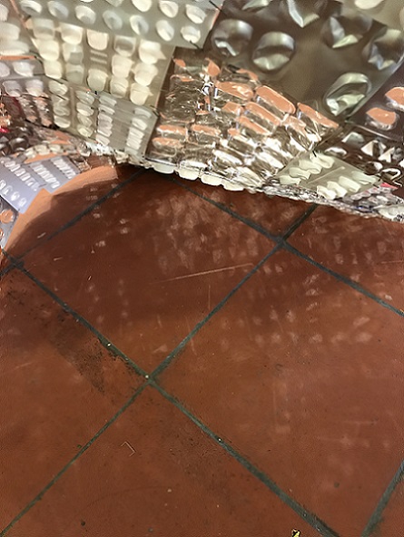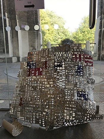 Sculpting with pill packets and a stapler was Displacement activity #9. I needed to do things that could be easily interrupted as I often had to stop what I was doing to talk to visitors or other artists or sort things out so I took my collection of pill packets…. and a stapler! I started hand stitching the packets together with red thread but soon realised it wasn’t immediate enough so I started stapling them together instead.
