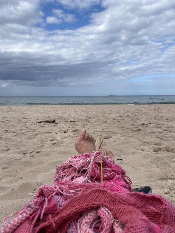 Frolicking with Flesh of my Flesh as a work in progress on the beach in Northumberalnd, August 2024. Click for the full image.