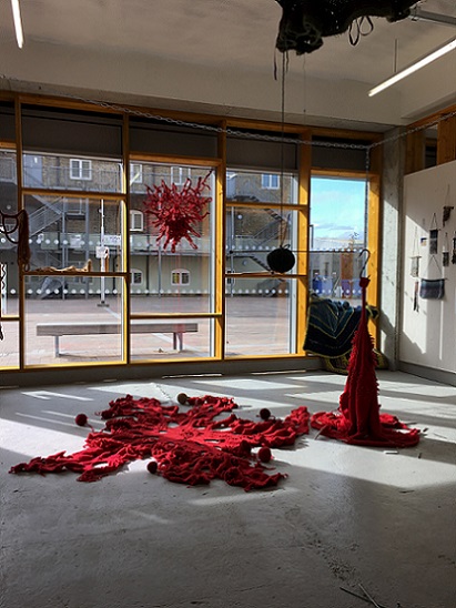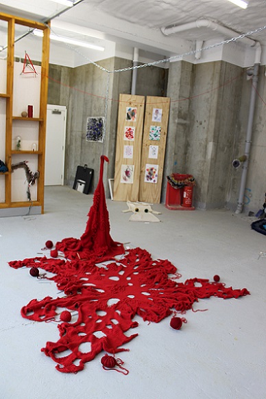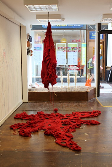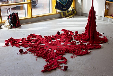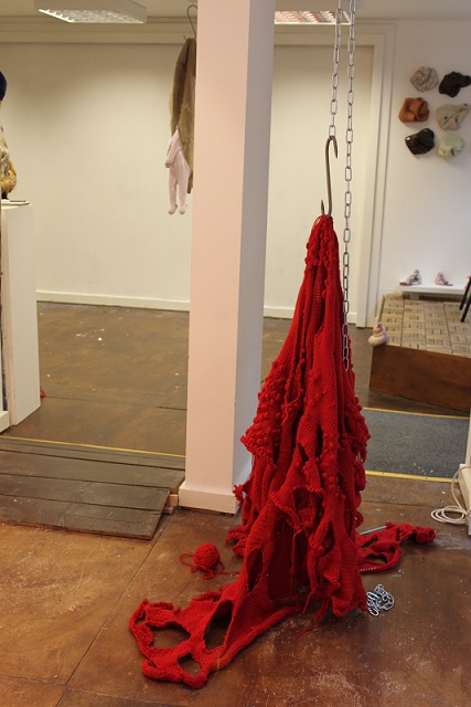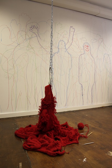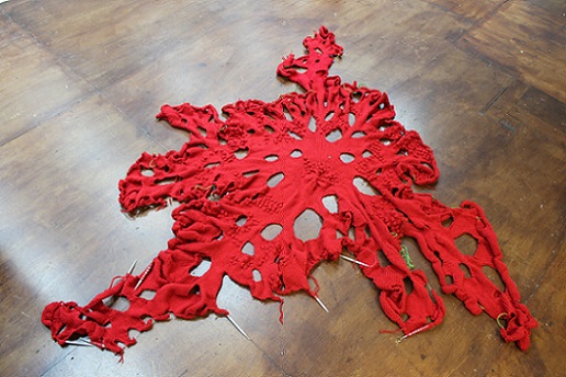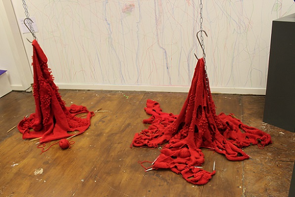 Heart of darkness is a large scale, two-part, abstract, red, hand knitted installation. It is unfinished, and partly unravelling. Sometimes I reattach several circular knitting needles so I could potentially carry on knitting at any point; sometimes it is left to unravel. Because of the flexible nature of the knitted wool, it’s very versatile and site responsive and can be installed in many different ways.