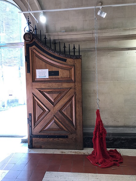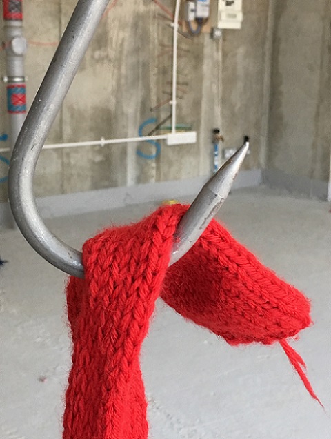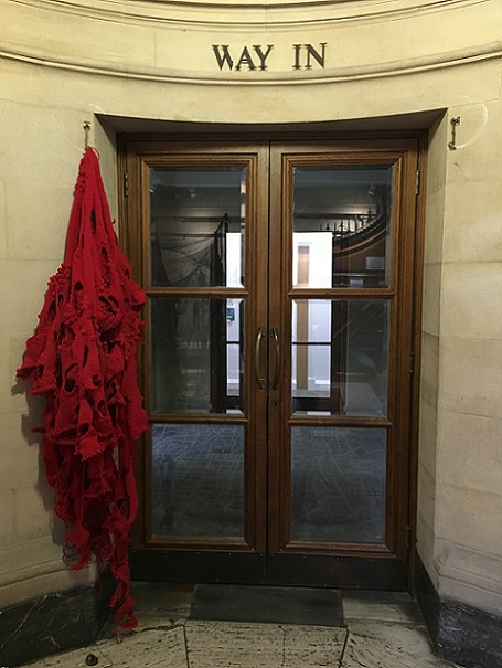a trail of red knitting in and out of the cells on the first floor of the prison, Sept-Oct 2019