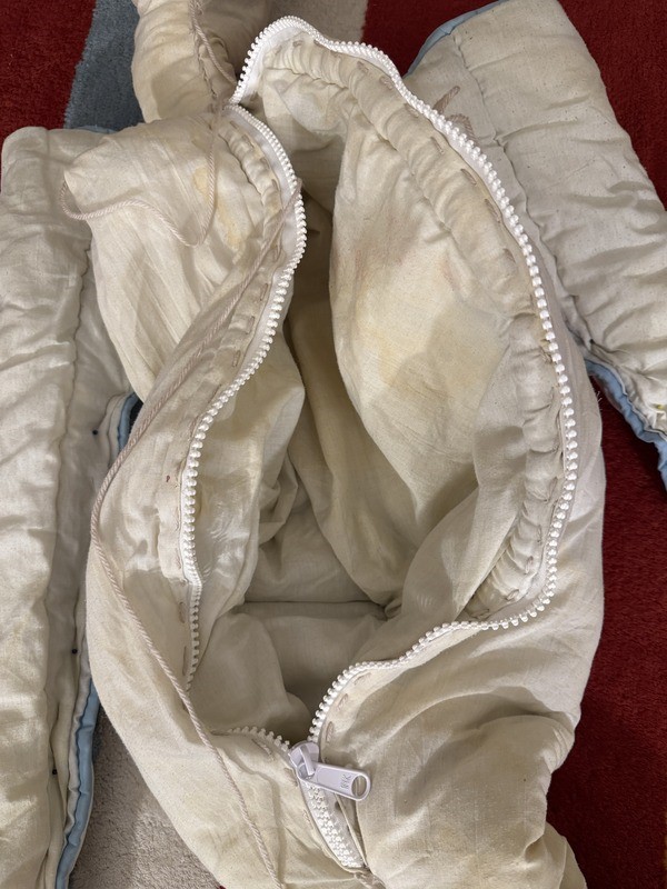 Used duvet, zip, stitch, hand knitted yarn from someone else’s stash, found netting
