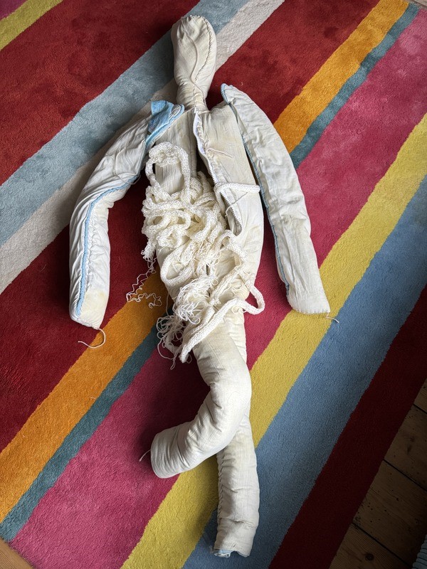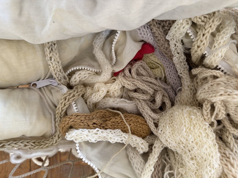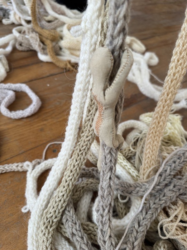 I have been knitting long thin sculptures over the last couple of months, using a selection of whites and beiges from another large stash of mixed yarn that had been collected by a friend’s late stepmother. I had been thinking about women being invisible as I knitted them, but, during the residency, I was reminded of how women’s bodies are seen by some as abject due to their leakiness – milk, blood, tears... and maybe emotions? So I decided to trial this installation, with the knittings pouring out of the stitched sculpture, pooling on the floor. It makes me think that maybe the work should be entitled The monster within?