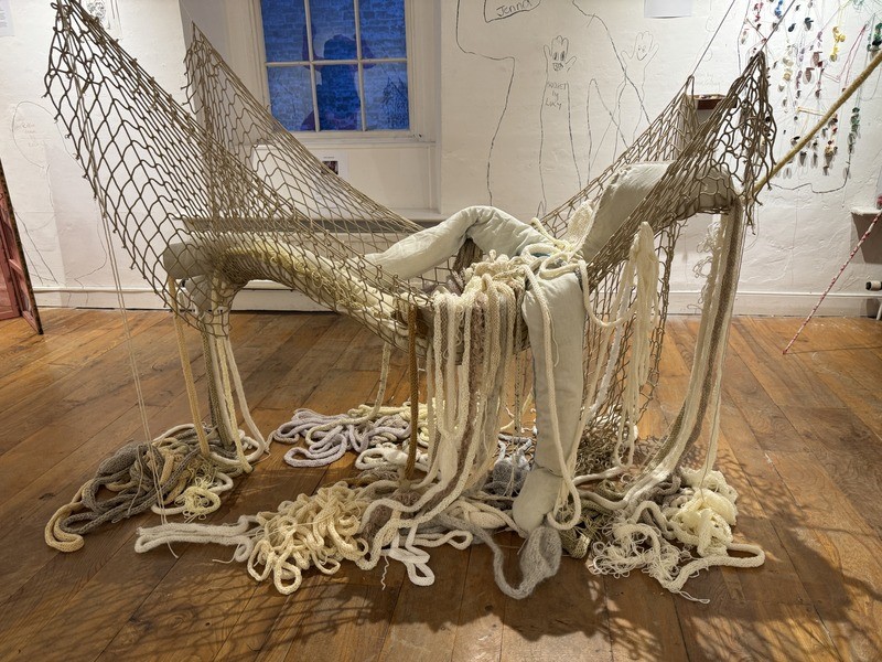 Subsequently, for the Merge Showtime, I made my very own Monster body out of the old duvet, and installed her, reclining in a hammock-like structure made with found netting, with multiple tentacular knitted sculptures spilling out of the zip stitched into her torso…