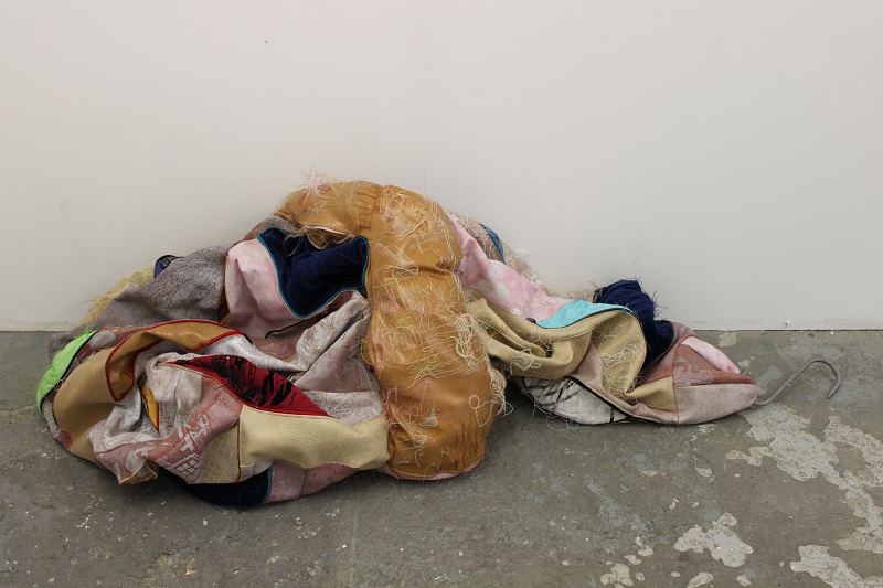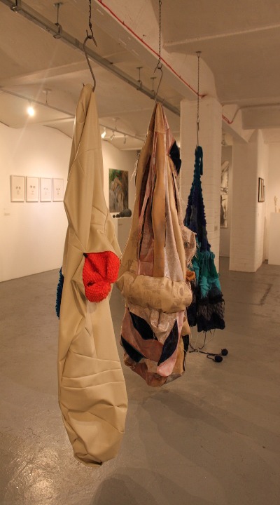 Nobodies is a series of three soft sculptures, hanging from meat hooks and chains, which explore ways that cloth and stitch can evoke the abject in art. The critical theorist, Julia Kristeva, describes the abject as the instinctive feeling of horror ‘to a threatened breakdown in meaning caused by the loss of the distinction between self and other’. It is that which inherently disturbs conventional identity and cultural concepts. In 2014, for my undergraduate dissertation,'Second skin: used clothing andrepresentations of the body in the work of Louise Bourgeois and Christian Boltanski', I researched the different ways that two fine artists use empty second-hand clothing in their work to suggest a physical absence and ultimately, death, the most extreme abjection. Choosing to use cloth in sculpture can powerfully subvert traditional representations of the body.