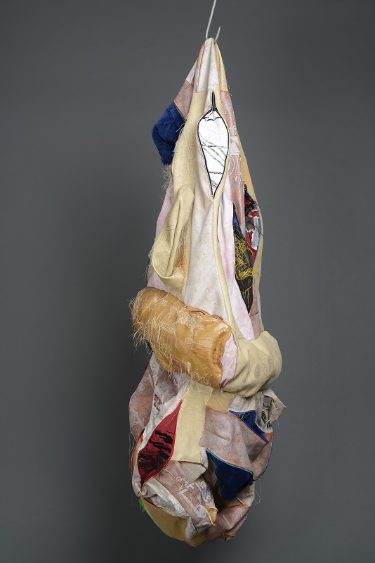 Nobody 1, 2014, imitation leather, found leather, velvet, used clothing, zips, hair, acrylic paint, stitch, print; H190 x W70 x D70 cm, 5.5kg approx