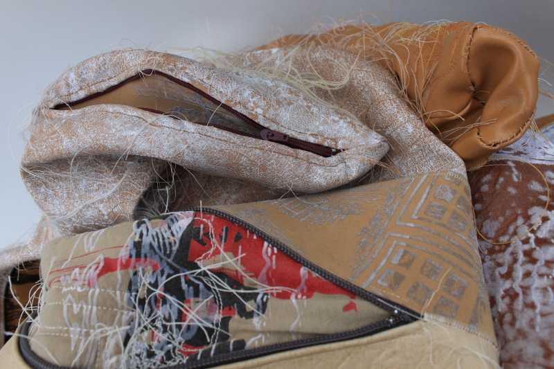 I used some of my son's old tshirts, printing them with images from the cutout photos using flocking. I also stitched some of the images, drawing them onto the leather and imitation leather, creating complex, textural, hairy skin-like surfaces. I stitched these parts together, like a crazy patchwork, using stuffing, zips and other devices to craete the form.
