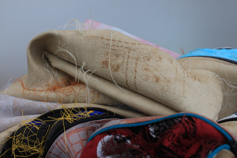 Nobody 1, 2014, detail of the stitched 'hairy' drawings on leather and imitation leather