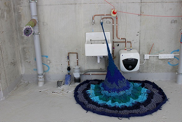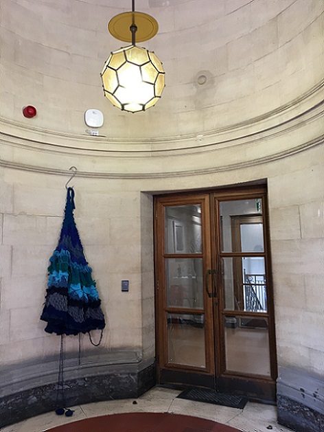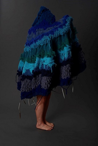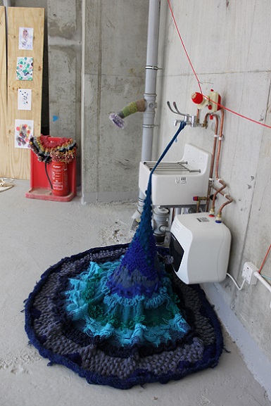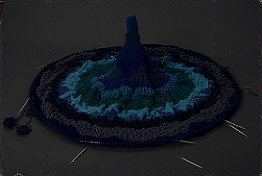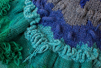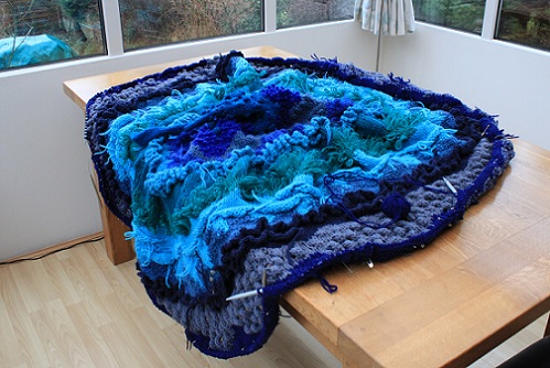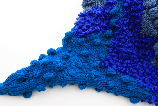 Observing the sea in many conditions, for this piece I was especially interested in capturing the constantly varying textures of the sea, so I used different sculptural knitting techniques in ever increasing concentric circles in a range of blues. Naturally, I am unable to emulate the fleeting nature of those changes through knitting, but it has a pleasing aesthetic.