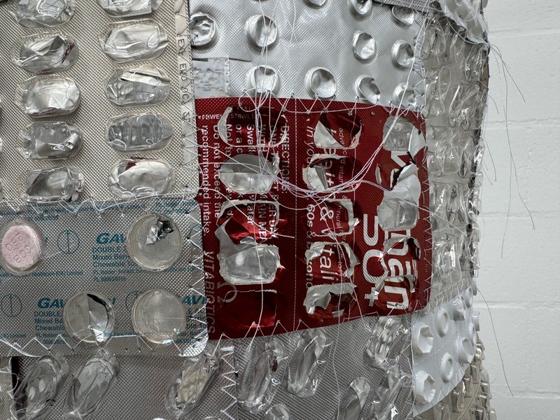 I have experimented with pill packets before, in 2017, using staples as stitches, with some interesting results. See Displacement activity 9 / Pharmacopoeia 1. This time I used my sewing machine. Again, there's something about the repetitive, and maybe rather pointless-seeming nature of sewing things together when they would normally be thrown out, that I find poignant. The work has associations for me with an attempt to mend something, but because its a difficult process stitching the metal and plastic pieces together, its also rather ineffectual and feels futile. I have left lots of loose ends of thread, almost invisible, again highlighting the fragility of the joins.