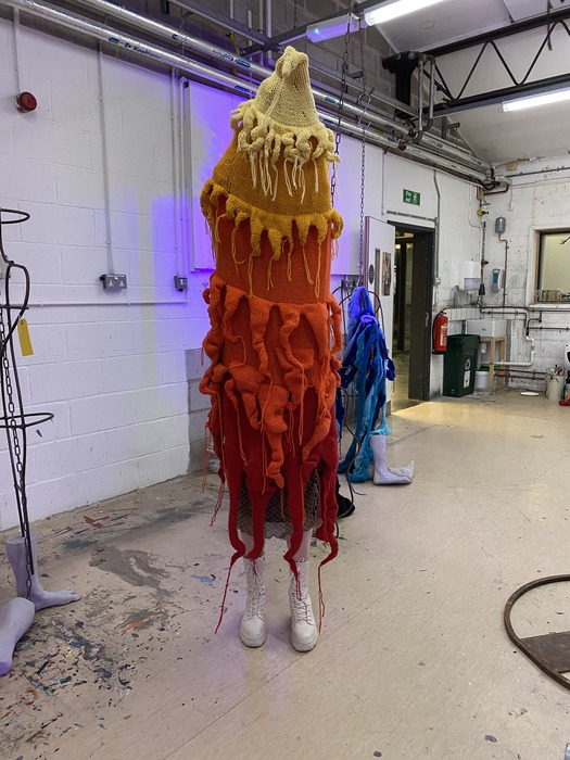 As well as a series of brightly coloured, garment-like sculptures that I made expressly for participation in 2018, there were also five Body cocoons which I made as part of my MA research during the Covid 19 lockdowns. Four of them became Parts of me 2020 and were exhibited at my Interim MA Degree Show at Bath Spa University, draped over steel bodies with cast feet. I subsequently knitted a fifth, Body cocoon 5. My Body cocoons became props for a series of private performances of me wearing them in isolated settings as the lockdowns eased. For more details of these performances see: